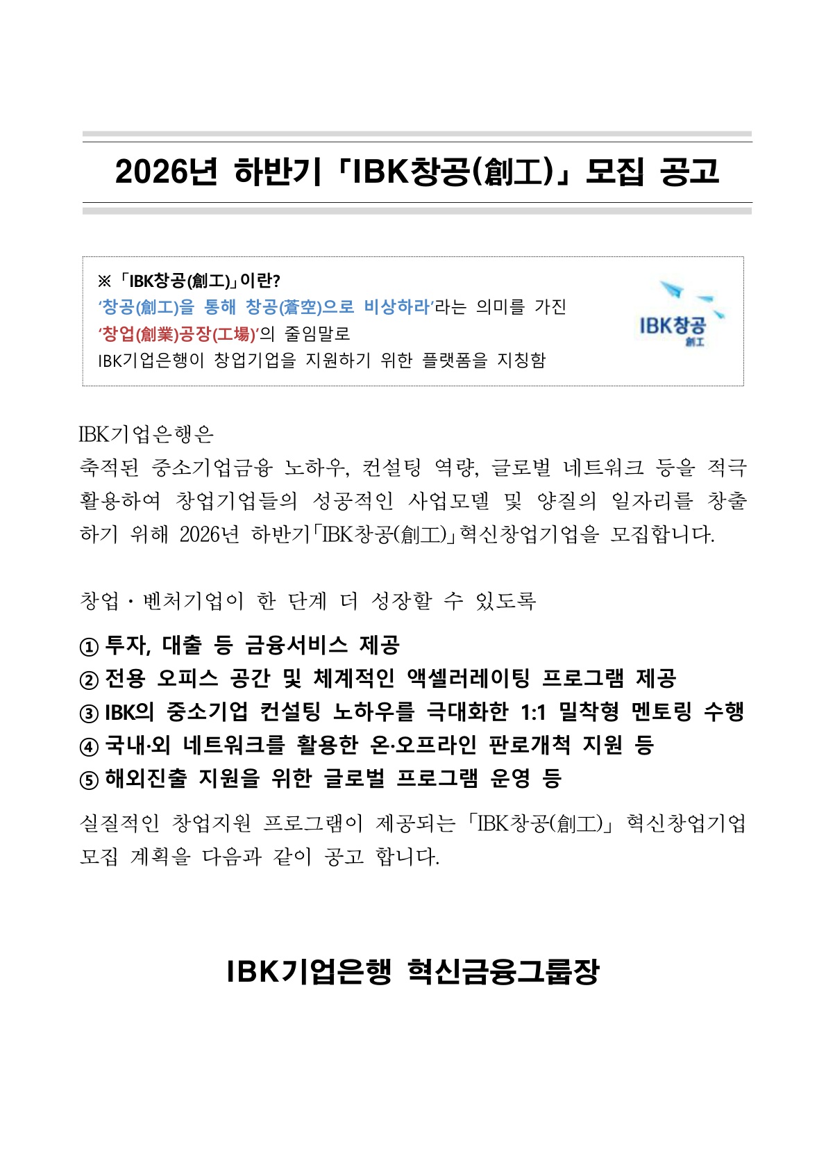 2026년 하반기「IBK창공(創工)」모집 공고