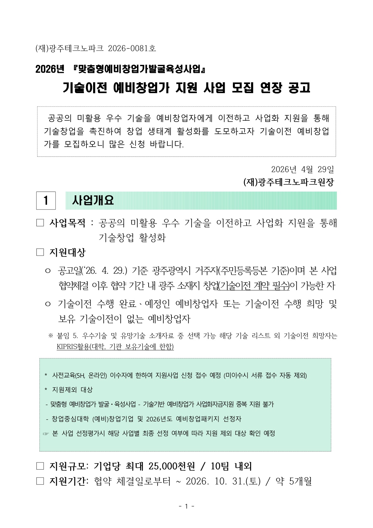 『2026년 맞춤형 예비창업가 발굴ㆍ육성사업』 - 기술이전 예비창업가 사업화자금지원 모집 연장 공고